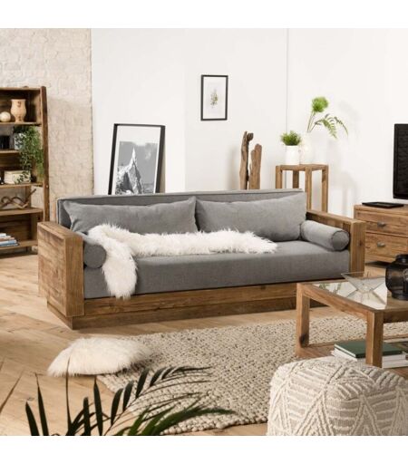 Macabane - sandy - Canapé 3 places bois Pin recyclé marron tissu gris