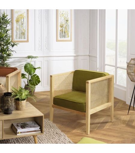 Macabane - agathe - Fauteuil cannage assise amovible velours vert