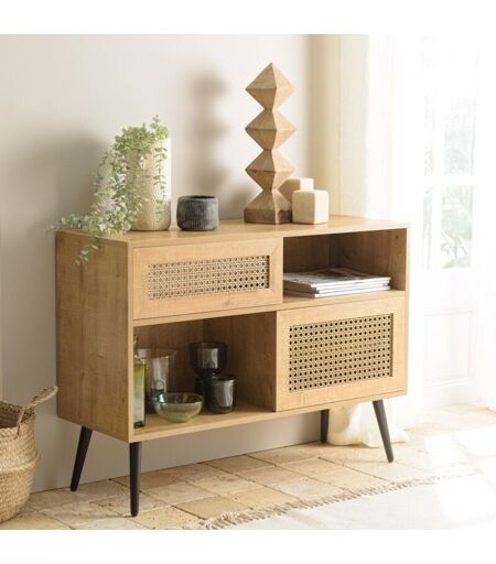 Macabane - charlie - Buffet bas marron 3 niches 2 portes effet cannage pieds métal