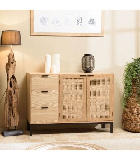 Macabane - marceau - Buffet 3 tiroirs 2 portes cannage naturel pieds métal noir
