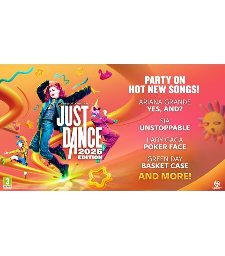 Just Dance 2025 EditionRassemblez vos amis et votre famille pour vous déhancher tous ensemble sur Just Dance ! Que ce soit pour faire la fête, faire du sport ou passer un bon moment en famille, Just Dance 2025 Edition et ses 40 nouveaux morceaux incroyables a tout ce qu'il vous faut.40 nouveaux titres fun qui plairont à tout le mondeIl y en a pour tous les goûts dans Just Dance 2025 Edition : dansez sur des tubes emblématiques, des incontournables de soirées, des grands classiques, des phénomènes d'Internet et bien plus encore, comme : yes, and? d' Ariana Grande, Unstoppable de Sia, Poker Face de Lady Gaga, Basket Case de Green Day, Calabria 2007 d' Enur feat. Natasja.Le mode entraînementEnvie de faire du sport en vous amusant ? Créez votre propre programme avec le mode entraînement ! Suivez les calories que vous brûlez et le temps que vous passez à danser pour rester motivé·e. Utilisez le mode entraînement pour vous dépenser sur des danses en solo ou avec votre famille et vos amis !Accédez à des centaines de chansons avec Just Dance+Chaque exemplaire de Just Dance 2025 Edition inclut un mois d'essai gratuit au service d'abonnement Just Dance+. Accédez aux centaines de titres qu'il contient (et à ceux ajoutés régulièrement) ainsi qu'à des avantages lors des événements en jeu. Dansez sur les hits légendaires des opus précédents ou sur de nouveaux titres exclusifs ! ...