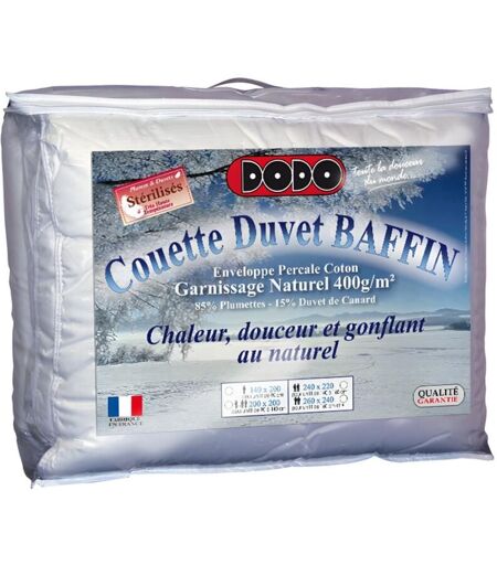 Dormir bien au chaud, c'est la promesse de la couette naturelle et des oreillers DODO BAFFIN. Grâce à sa composition duvet et plumettes, ils offrent un pouvoir calorifique élevé et garde la chaleur tout au long de la nuit. Spécialiste du sommeil, la marque DODO s’appuie sur 80 ans de savoir-faire 100% français afin de proposer une large gamme d’accessoires de literie (couettes, oreillers, surconforts de matelas, etc) made in France. DODO est le partenaire de vos nuits pour vous garantir un bien être accessible parce que « tout le monde mérite un bon DODO ». Caractéristiques Couleur (nuance) : Blanc Matière : Coton, Duvet Taille : 240x260 cm Nombre de places : 2 places Garnissage : Plumes Grammage textile : 400 g/m 2 Indice de chaleur : Chaude Traitement : Anti-moisissure Gamme : Good for Planet Produit éco-responsable : Fabriqué en France : Garnissage : 15% duvet canard, 85% plumettes : Garnissage stérilisé anti-allergies, anti-moisissures : Enveloppe 100 % percale de coton, 80 fils : ...