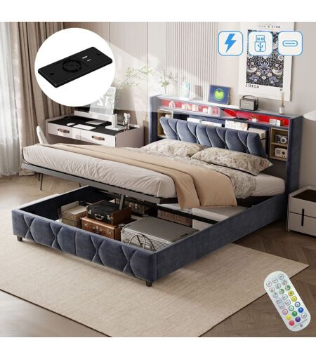 Tissu de haute qualité et couleurs classiques : Ce lit est fabriqué en tissu Velours de premier choix, alliant durabilité et confort, il s’adapte parfaitement à divers styles de décoration intérieure, offrant une touche de sophistication et de chaleur à votre chambre. Rangement pratique et fonctionnel : Doté de rangement de la tête de lit, ce modèle offre un espace de rangement pratique pour vos petits objets personnels. De plus, les étagères intégrées ajoutent un espace supplémentaire pour vos livres, réveils ou décorations, optimisant ainsi l’organisation de votre espace. Ambiance lumineuse personnalisable : La bande LED multicolore intégrée vous permet de personnaliser l'éclairage de votre chambre. Grâce à la télécommande, vous pouvez facilement ajuster les couleurs et l’intensité lumineuse pour créer l'ambiance idéale, que ce soit pour se détendre ou ajouter une touche festive à votre décor. Ports de charge intégrés : Le lit est équipé de deux ports de charge pratiques, un port ...