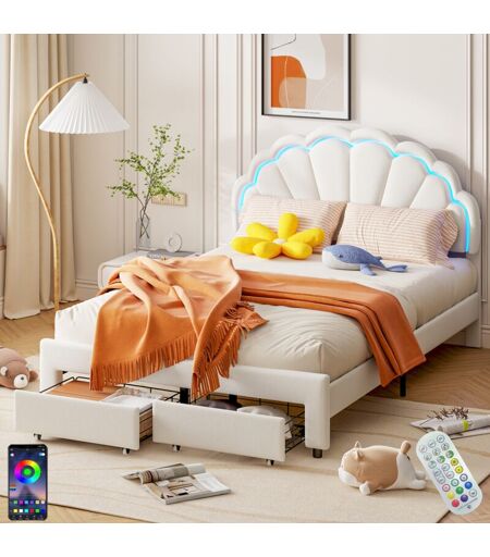 Dans Les Nuages - Lit adulte 140x190 cm, avec tête de lit en forme de fleur, 2 tiroirs de rangement, app, cadre en métal, sommier à lattes en bois,
