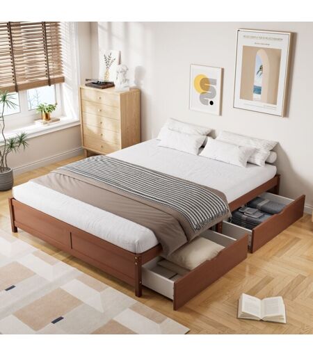 Dans Les Nuages - Lit 140x200 cm, avec 2 tiroirs, dotés de roulettes, Pas de tête de lit, sommier à lattes, lit adulte en bois - Marron