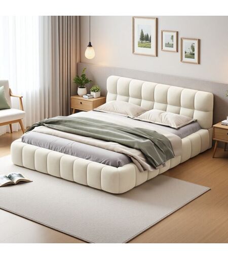 Design unique et fixation sécurisée : Ce lit rembourré présente un design innovant qui crée un effet d'encastrement pour le matelas. Ce mécanisme unique fixe le matelas en place de manière efficace, vous offrant ainsi une stabilité et une sécurité optimales pendant votre sommeil. Tête de lit confortable : La tête de lit de ce lit double est généreusement remplie de mousse haute densité. Cette conception offre une excellente élasticité et un confort supérieur, permettant à la tête de lit de fournir un soutien optimal lorsque vous lisez ou regardez la télévision au lit. Tissu de haute qualité: Fabriqué à partir de tissus de coton et de lin de haute qualité, ce lit rembourré se distingue par sa texture fine et douce. Ce choix de matériaux améliore considérablement votre confort, vous offrant une expérience de sommeil luxueuse et agréable. Structure robuste : La construction du lit utilise un panneau de fibres massif et un panneau de particules, garantissant un soutien solide et stable. ...