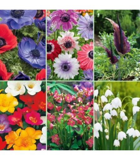 76 bulbes + 25 OFFERTS: 15 bulbes + 5 OFFERTS Anémone géantes de Caen, 15 bulbes + 5 OFFERTS Anémone double Ste Brigid, 1 Arum Dracunculus Vulgaris, 15 bulbes + 5 OFFERTS Freesias , 15 bulbes + 5 OFFERTS Oxalis Deppei, 15 bulbes + 5 OFFERTS Leucojum aestivum summer... Glissez vers le bas pour plus d'informations et pour découvrir comment planter & entretenir ses bulbes à fleurs ...
