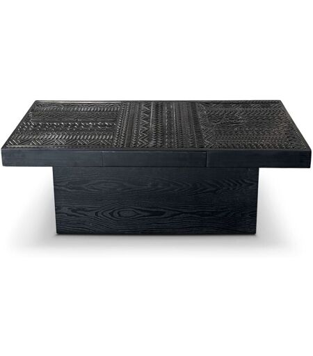 Élégance ethnique et fonctionnalité raffinée Coloris NOIR Ajoutez une touche d'exotisme chic à votre intérieur avec la table basse KINSHASA. Avec son plateau sculpté, cette pièce d'exception séduit par son design inspiré de l'art tribal africain, révélant un jeu de motifs géométriques gravés dans le bois qui attire immédiatement le regard. Avec ses dimensions généreuses (L120 x P60 x H43 cm), KINSHASA s'impose au cœur du salon tout en restant parfaitement proportionnée pour accompagner un canapé 2 ou 3 places. Son coloris noir profond et ses reliefs graphiques en font une œuvre sculpturale à part entière, idéale pour une décoration ethnique chic, bohème contemporaine ou coloniale moderne. Mais KINSHASA ne se contente pas d'être belle : elle est aussi pratique au quotidien, grâce à ses 2 tiroirs discrets, intégrés de part et d'autre du plateau. Parfaits pour ranger télécommandes, magazines ou petits objets, ces compartiments apportent une fonctionnalité précieuse sans nuire à ...