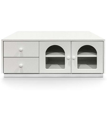 Table basse 100cm blanc texturé avec tiroirs et portes vitrées Coloris BLANC Cette table basse VOLOS de 100cm de large est un véritable ajout décoratif et fonctionnel pour votre salon. Fabriquée en M.D.F. avec une texture en relief blanc, elle s'harmonise parfaitement avec des intérieurs modernes ou scandinaves, ajoutant une touche de luminosité et d'élégance. Son design est similaire à celui du meuble TV assorti, mais dans un format compact idéal pour le centre de votre espace de vie. Elle est dotée de quatre tiroirs (2 devant et 2 derrière) parfaits pour ranger vos télécommandes, magazines ou autres petits objets. À côté des tiroirs, deux portes vitrées (4 en tout) avec une découpe arrondie apportent un style original et permettent de mettre en valeur des objets décoratifs ou de ranger vos livres et accessoires tout en les gardant à portée de main. Caractéristiques : Finition : bois texturé en relief, coloris blanc Rangement : 4 tiroirs et 4 portes vitrées Poignées rondes assorties ...