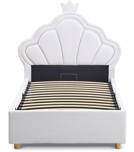 Lit 1 place avec sommier relevable et tête de lit coquillage - 90x190cm Coloris BLANC Offrez une touche féérique à la chambre de votre enfant avec ce lit 1 place en simili blanc QUEENIE, conçu pour allier praticité et esthétique. Sa tête de lit originale en forme de coquillage, ornée d'une délicate couronne en son sommet, apporte un charme enchanteur qui ravira les petits rêveurs. Sous le sommier relevable, un espace de rangement spacieux permet d'optimiser la chambre en stockant jouets, linge de lit ou objets du quotidien, pour une pièce toujours bien ordonnée. La finition en simili blanc est facile à entretenir et confère une élégance moderne et douce, idéale pour s'intégrer à toutes les décorations. Ce lit au design unique et au confort optimal est parfait pour transformer chaque nuit en une aventure magique, tout en offrant un maximum de fonctionnalité. Dimensions : L100 x P205 x H120 cm Matière : Simili & P.U. / Bois ...