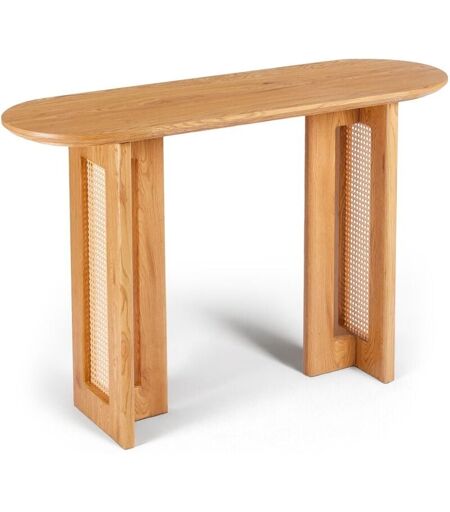 L'élégance naturelle et fonctionnelle Coloris CHÊNE CLAIR Apportez une touche d'authenticité et de raffinement à votre intérieur avec la console BOHEMIA, une pièce au design intemporel qui allie avec brio chaleur du bois et délicatesse du cannage. Avec ses dimensions de 120x40cm et sa hauteur de 78cm, elle se glisse avec élégance dans une entrée, un salon ou même une chambre, offrant un espace aussi pratique qu'esthétique. Son plateau en bois aux formes arrondies repose sur un piètement ajouré sublimé par des panneaux en cannage naturel, un détail raffiné qui insuffle une atmosphère chaleureuse et bohème à votre décoration. Légère et aérienne, cette console apporte du charme et du caractère, tout en conservant une grande polyvalence d'usage. Que vous l'utilisiez comme espace d'exposition pour vos objets déco, comme meuble d'appoint dans un couloir ou encore comme coiffeuse élégante, la console BOHEMIA s'adapte à toutes vos envies. Un must-have pour un intérieur tendance et harmonieux, ...