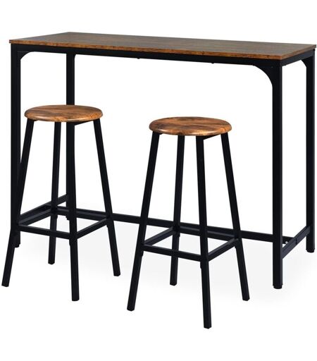 Ensemble table de bar et tabourets – Esprit industriel et convivialité Coloris BOIS RUSTIQUE & NOIR Alliez style et praticité avec l'ensemble JOSTIN, composé d'une table de bar et de deux tabourets assortis. Son design minimaliste aux accents industriels apporte une touche authentique et moderne à votre intérieur. Avec son plateau en bois de 120cm de long et sa structure en métal noir, la table offre un équilibre parfait entre robustesse et élégance. Ses dimensions compactes (120 x 50 x 90 cm) en font une solution idéale pour les petits espaces, tout en offrant un espace confortable pour partager un repas ou un verre entre amis. Les deux tabourets assortis, d'une hauteur de 67cm, sont conçus pour s'intégrer parfaitement sous la table, optimisant ainsi l'espace lorsqu'ils ne sont pas utilisés. Leur assise en M.D.F impression bois rustique et leur structure en métal noir garantissent un confort et une stabilité optimaux. Que ce soit pour un coin repas, un espace bar ou une cuisine ...