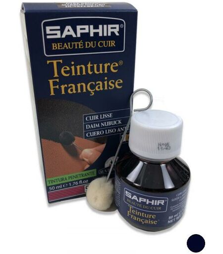 TEINTURE FRANCAISE Cuir Liquide Saphir, 50 ml, couleur bleu marine . Produit de la gamme : teintures cuir. Ean : 3324010812062 Teinture pour tous cuirs lisses, daim, nubuck et cuir veloutés. Formule pénétrante a base d'alcool, utilisable en couche de ... ...