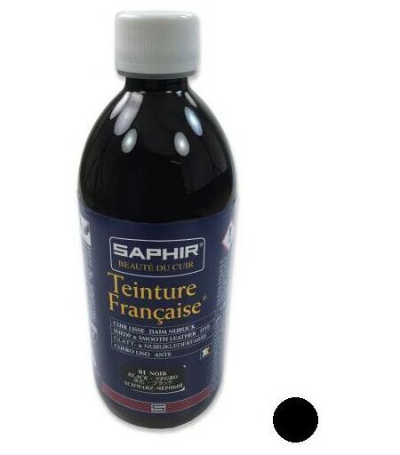TEINTURE FRANCAISE Cuir Liquide Saphir, 500 ml, couleur noir . Produit de la gamme : teintures cuir. Ean : 3324010814011 Teinture pour tous cuirs lisses, daim, nubuck et cuir veloutés. Formule pénétrante a base d'alcool, utilisable en couche de ... ...