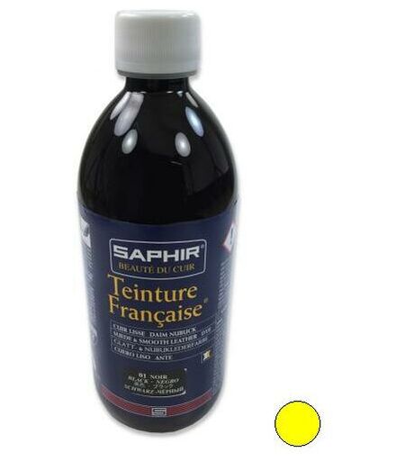 TEINTURE FRANCAISE Cuir Liquide Saphir, 500 ml (bases spéciales), couleur base jaune . Produit de la gamme : teintures cuir. Ean : 3324010814530 Teinture pour tous cuirs lisses, daim, nubuck et cuir veloutés. Formule pénétrante a base d'alcool, utilisable en couche de ... ...