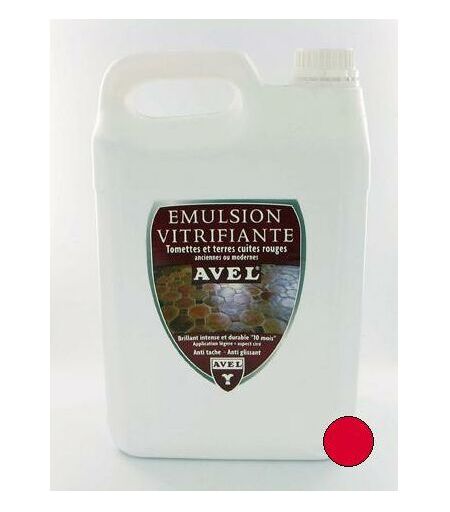 Emulsion Vitrifiante Tomettes Rouges AVEL, 5 litres, couleur rouge . Produit de la gamme : entretien pierre. Ean : 3324014902905 Entretien et protège très facilement les terres cuites rouges… contre les taches d'huile, vin, alcool, eau savonneuse, oxygénée ou ... ...