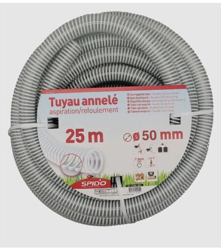 Tuyau en PVC armé souple à spirales 7 m Ø 50 mm Tuyau PVC armé souple à spirales pour l'aspiration et l'évacuation, spécialement conçu pour l'aspiration et l'évacuation des liquides. Il a une longueur de 7 mètres et un diamètre de 50 mm. ...
