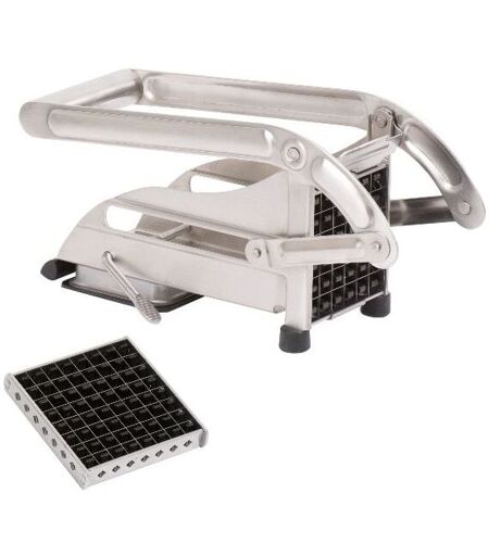 Coupe-frites à 2 grilles Inox - Faites vous-même vos frites maison! - Le coupe-frites manuel tout inox vous assure une qualité de coupe nette et régulière de vos pommes de terre en quelques secondes - Sa conception le rend quasi inusable - Son grand bras de levier permet de passer la pomme de terre sans effort intense - Livré avec 2 grilles pour des frites de 8 mm ou de 11 mm d'épaisseur - Dimensions : 26 x 12,5 x 9 cm (hauteur bras levé : 30 cm) . ...