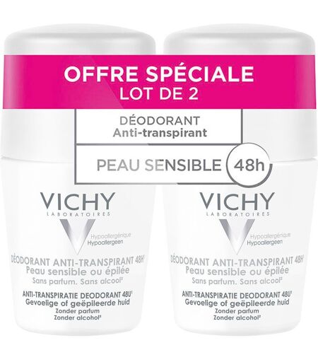 Vichy LOT*2 Déodorant Anti-Transpirant 48H - Roll-On Peau Sensible 2 x 50 ml Rouleau 100