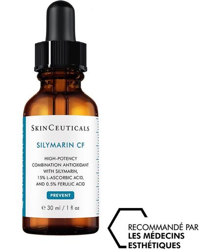 SkinCeuticals, la haute efficacité recommandée et prescrite par les dermatologues, médecins et chirurgiens esthétiques. Nos formules associent une forte concentration en actifs purs à des textures à haute absorption cutanée pour offrir une haute efficacité anti-âge autour de 3 principes fondamentaux : prévenir, corriger et protéger. SÉRUM ANTIOXYDANT HAUTE PERFORMANCE ANTI-IMPERFECTIONS ASSOCIANT 15% DE VITAMINE C PURE, 0.5% D’ACIDE FERULIQUE, 0.5% DE SILYMARINE ET 0.5% D’ACIDE SALICYLIQUE. Silymarin CF combine la vitamine C, l’acide férulique et la silymarine, aux propriétés antioxydantes, pour optimiser la protection de la peau contre les dommages radicalaires. En neutralisant l’oxydation des lipides présents dans le sébum, la silymarine prévient la formation d’imperfections cutanées. Tout en améliorant les signes visibles de l’âge tels que les ridules, Silymarin CF permet d’affiner le grain de peau, de réduire la brillance et l’apparence des pores dilatés. Formulé avec une texture fluide qui pénètre rapidement dans la peau sans laisser de film gras, ce sérum antioxydant convient à tous les types de peaux et est idéal pour les peaux grasses et/ou sujettes aux imperfections. Indication Ce produit est recommandé si votre peau est: Tous types de peaux,Grasse,Mixte,A tendance acnéique,Mature,Jeune,Normale,Sèche,Sensible Conseils d'utilisation Le matin, sur peau propre, appliquer 3 à 4 gouttes sur l’ensemble du visage, du cou et du décolleté Précautions Le flacon peut être sous pression, ouvrir avec précaution. Éviter le contact direct avec les yeux. En cas de contact, rincer abondamment à l’eau claire. Si des irritations apparaissent, espacer les applications jusqu’à ce que la peau s’habitue. Usage externe. Conserver dans un endroit frais et sombre. Composition AQUA / WATER, ALCOHOL DENAT., ASCORBIC ACID, PROPYLENE GLYCOL, DIPROPYLENE GLYCOL, LAURETH-23, SILYBUM MARIANUM FRUIT EXTRACT, SODIUM CITRATE, SALICYLIC ACID, FERULIC ACID (F.I.L. D251111/1). Les listes d’ingrédients entrant dans la composition des produits de notre marque sont régulièrement mises à jour. Avant d’utiliser un produit de notre marque, vous êtes invités à lire la liste d’ingrédients figurant sur son emballage afin de vous assurer que les ingrédients sont adaptés à votre utilisation personnelle ...