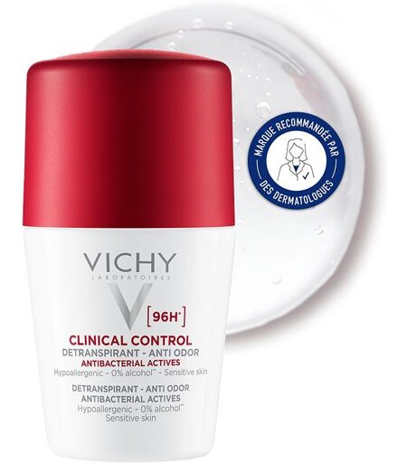 CLINICAL CONTROL 96H Detranspirant est cliniquement prouvé pour contrôler la transpiration excessive :96H Dry TouchAnti-odeurs et anti-humiditéAntibactérienDéveloppée sous contrôle dermatologique, sa formule unique permet à la peau de respirer et assure une tolérance et un confort optimaux.Formule respirante qui laisse la peau douce et confortable :96% des femmes disent que leur peau est douce.*96% des femmes disent que le produit ne dessèche pas la peau.*Auto-évaluation, 80 femmesFormule contenant des ingrédients antibactériens et du zinc purifiant pour combattre les odeurs à leur source.**Avec des sels d'aluminiumBénéficesContrôle la transpiration excessiveDry TouchAnti-odeur et anti-humiditéAntibactérienIndicationsPeaux sensiblesConseils d'utilisationAppliquez sur des aisselles propres et sèches.CompositionAQUA / WATER - ALUMINUM CHLOROHYDRATE - DIMETHICONE - C14-22 ALCOHOLS - PARFUM / FRAGRANCE - STEARETH-100/PEG-136/HDI COPOLYMER - PERLITE - ZINC PCA - C12-20 ALKYL GLUCOSIDE - PENTYLENE GLYCOLConditionnementRoll-on de 50 ml ...