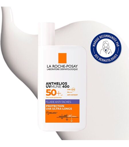 La Roche-Posay Anthelios UVmune 400 Fluide anti-taches SPF 50+ Haute protection solaire qui prévient et réduit les taches pigmentaires induites par les rayons UV grâce à la combinaison inédite de deux actifs brevetés de La Roche-Posay : le Mexoryl 400 : le filtre solaire le plus efficace contre les rayons UV qui pénètrent le plus [380-400nm], & Le Melasyl, premier actif à intercepter l’excès de mélanine avant qu’elle ne marque la peau.IndicationCe produit est recommandé si votre peau est: Tous types de peauxApplicationAppliquez Anthelios UVMUNE 400 Fluide anti-taches SPF50+ avant chaque exposition au soleil afin de réduire les risques de cancer cutané et de vieillissement prématuré de la peau. Renouvelez fréquemment et généreusement l'application pour maintenir une protection optimale, notamment après la baignade ou une forte transpiration.IngrédientsAQUA / WATER / EAU • ALCOHOL DENAT. • SILICA • DIISOPROPYL ADIPATE • DIISOPROPYL SEBACATE • ETHYLHEXYL TRIAZONE • BUTYL METHOXYDIBENZOYLMETHANE • BIS-ETHYLHEXYLOXYPHENOL METHOXYPHENYL TRIAZINE • DICAPRYLYL CARBONATE • GLYCERIN • PROPANEDIOL • C12-22 ALKYL ACRYLATE/HYDROXYETHYLACRYLATE COPOLYMER • DIETHYLAMINO HYDROXYBENZOYL HEXYL BENZOATE • C12-15 ALKYL BENZOATE • METHOXYPROPYLAMINO CYCLOHEXENYLIDENE ETHOXYETHYLCYANOACETATE • PERLITE • DROMETRIZOLE TRISILOXANE • ACRYLATES/C10-30 ALKYL ACRYLATE CROSSPOLYMER • CITRIC ACID • DISODIUM PHOSPHATE • HYDROXYACETOPHENONE • HYDROXYETHYLCELLULOSE • 2-MERCAPTONICOTINOYL GLYCINE • PENTAERYTHRITYL TETRA-DI-T-BUTYL HYDROXYHYDROCINNAMATE • PENTYLENE GLYCOL • POLYSORBATE 60 • SODIUM PHOSPHATE • SODIUM THIOSULFATE • TEREPHTHALYLIDENE DICAMPHOR SULFONIC ACID • TOCOPHEROL • TRIETHANOLAMINE • TRISODIUM ETHYLENEDIAMINE DISUCCINATE (F.I.L. N70050242/1).Les listes d’ingrédients entrant dans la composition des produits de notre marque sont régulièrement mises à jour. Avant d’utiliser un produit de notre marque, vous êtes invités à lire la liste d’ingrédients figurant sur son emballage afin de vous assurer que les ingrédients sont adaptés à votre utilisation personnelle ...