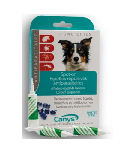 Parapharmacie > Vétérinaire > Anti-parasites > Anti-puces et anti-tiques > Anti-puces et anti-tiques chien > Pipette anti-puces et anti-tiques chien Canys Spot-On Pipettes Répulsives Antiparasitaires Chien Pipettes x 3