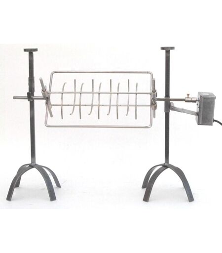 Équipé d'une broche L50 cm, un moteur électrique force 10 kg (2t/min), une broche anglaise avec un cadre 37*24 cm et deux piétements à poser au sol ou sur un support réfractaire. S'utilise pour une cuisson de votre pièce de viande au feu de bois ou au charbon de bois. A positionner devant votre feu de cheminée ou en plein air. ...