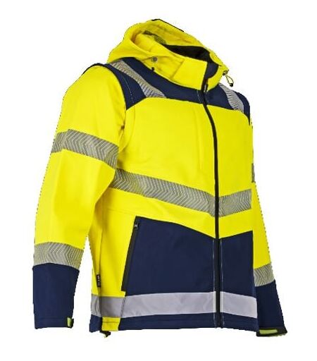 Veste softshell - HV - manches amovibles - capuche amovible - bas de manche ajustable - poche zippée poitrine - 2 poches basses fermeture par zip waterproof - dos long - 1 poche poitrine zippée - NORME : EN 20471 Classe 2 (classe 1 sans manche). 94% polyester - 6% élasthanne. ...