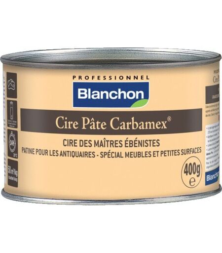 Cire Pâte CARBAMEX BLANCHON / BRIANCON Patine utilisée par les antiquaires pour la restauration des meubles, peut aussi être utilisé sur tous bois d'intérieures ainsi que sur du parquet. Formule unique à base de cire végétale de Carnauba et très appréciée par les maitres ébénistes. Apporte un brillant sec, profond et durable. réchauffe la couleur du bois. Résiste a l'humidité, évite les traces de doigt, et ne colle pas. Conditionnement : 400g Finition (au choix) : Consommation : 50m² / Litre ...