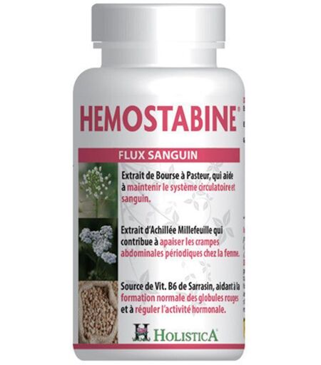 Complément alimentaire à utiliser dans le cadre d’une alimentation variée, équilibrée et d’un mode de vie sain.Holistica Hémostabine® est un complément alimentaire qui combine des extraits de bourse à pasteur, d'achillée millefeuille et du sarrasin, enrichi en vitamines B naturelles, pour soutenir la circulation sanguine et le confort menstruel. Il aide à réguler l'activité hormonale et à maintenir une bonne fonction vasculaire.IngrédientsExtrait de Bourse à Pasteur (parties aériennes) (Capsella bursa-pastoris (L.)), extrait d’Achillée Millefeuille (parties aériennes) (Achillea millefolium (L.)), hypromellose (gélule d’origine végétale), Sarrasin (graines germées) (Fagopyrum Esculentum), antiagglomérant : stéarate de magnésium d’origine végétale.Valeurs nutritionnelles Composant Pour 4 gélules Pour 5 gélules Extrait de bourse à pasteur 800 mg 1000 mg Extrait d'achillée millefeuille 500 mg 625 mg Graines germées de sarrasin 168 mg 210 mg B1 0,27 mg (24 %*) 0,34 mg (30 %*) B6 0,25 mg (18 %*) 0,32 mg (23 %*) Conseils d'utilisationPrenez 2 gélules, deux fois par jour pendant les repas. En cas de besoin accru, jusqu’à 5 gélules par jour.Précautions d'emploiConserver dans un endroit frais et sec. Tenir hors de portée des enfants. Ne pas consommer en cas d’utilisation simultanée d’anticoagulants ou d’antidépresseurs. Déconseillé aux femmes enceintes ou allaitantes et aux personnes allergiques aux plantes de la famille des Astéracées.Poids net60 gélulesAdresse du FabricantHolistica465 Chemin des Jallassières13510 EguillesFrance ...
