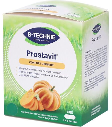 Complément alimentaire à utiliser dans le cadre d’une alimentation variée, équilibrée et d’un mode de vie sain.PROSTAVIT® est un complément alimentaire spécialement conçu pour l’équilibre de l’homme vieillissant.PROSTAVIT® contient non seulement de l’huile de graines de courge, de la racine d’ortie, du pin maritime, du thé de Java et de l’échinacée pâle, mais aussi du sabal.¹La courge est bénéfique pour le bon fonctionnement de la prostate et aide à maintenir une fonction urinaire normale chez l’homme.²Le zinc contribue au maintien de niveaux normaux de testostérone.IndicationsConvient uniquement aux hommes adultes.IngrédientsHuile de graines de courge (cucurbita pepo), gélatine, gélifiant : glycérine, extrait de Urtica dioica (ortie, racine), huile de tournesol (Helianthus annuus), oxyde de magnésium, extrait de Pinus pinaster (pin maritime, écorce), extrait de thé de Java (feuille- Orthosiphon aristatus), eau, gluconate de zinc, stabilisant : cire d’abeille, émulsifiant : lécithine de tournesol, extrait de Echinacea pallida (échinacée pâle, racine), antiagglomérant : dioxyde de silicium [nano], d-alphatocophérol, colorant : oxyde de fer, extrait de Serenoa repens (sabal, fruit).Valeurs nutritionnelles Ingrédient Quantité pour 2 capsules Cucurbita pepo extr. 857 mg Urtica dioica extr. 200 mg Pinus pinaster extr. 120 mg Stérols végétaux (75% B-sitostérol) 90 mg Ortosiphon aristatus extr. 100 mg Serenoa repens extr. (45% acides gras) 5 mg Echinacea pallida extr. 40 mg Magnésium 80 mg (21%*) Zinc 8 mg (80%*) Vitamine E 13,4 mg α-TE (111%*) Conseils d'utilisation1 capsule 2 fois par jour à prendre avec un verre d’eau, pendant un mois. Puis 1 capsule par jour, selon le besoin.Précautions d'emploiDemandez l’avis de votre médecin et/ou pharmacien.Évitez la consommation de plus de 3 grammes de stérols / stanols végétaux ajoutés par jour.Ce produit ne convient pas aux personnes qui doivent maîtriser leurs taux de cholestérol dans le sang.Utilisez le produit uniquement sous la supervision d’un médecin, si vous prenez des médicaments anticholestérol.Consommez régulièrement des légumes et des fruits pour maintenir le niveau de caroténoïdes à jour. Convient uniquement aux hommes adultes.Déconseillé en cas d’insuffisance cardiaque ou rénale œdémateuses, en cas de pathologie du système immunitaire ou de prise de médicaments affectant le système immunitaire et en cas d’allergie croisée connue, en particulier aux plantes de la famille des Asteraceae.Tenir hors de portée des jeunes enfants.Ne pas dépasser la dose recommandée. Un complément alimentaire ne doit pas se substituer à une alimentation variée et équilibrée et à un mode de vie sain.Poids net80 gélulesAdresse du FabricantCosmédiet-Biotechnie470, Avenue de Lossburg69480 AnseFrance ...