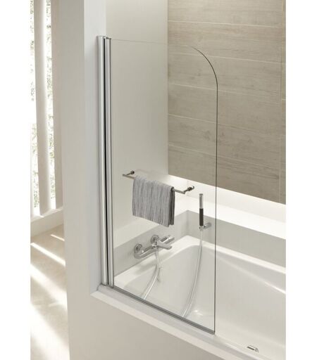 Mampara de bañera con 1 panel pivotante y perfiles cromados Vidrio templado transparente anti-calcáreo de 6 mm de grosor, acabado en curva. Incluye práctico toallero. Medidas 145cm de altura y 80cm de ancho Vidrio templado de seguridad transparente de 6 mm de grosor con tratamiento anti-calcáreo. FÁCIL ACCESO: 1 panel pivotante. COMODIDAD DE INSTALACIÓN: Mampara reversible derecha/izquierda para mayor posibilidad de instalación. Perfiles cromados incluidos. FÁCIL MANTENIMIENTO: Vidrio transparente con tratamiento anti-calcáreo anticalcáreo para una fácil limpieza. INCLUYE práctico y estético toallero para colgar las toallas. ACABADO PERFECTO: perfiles de aluminio cromados con tapa superior de embellecedor y sin tornillería aparente. INSTALACIÓN: Incluye todo lo necesario para su instalación completa. Perfiles e ...