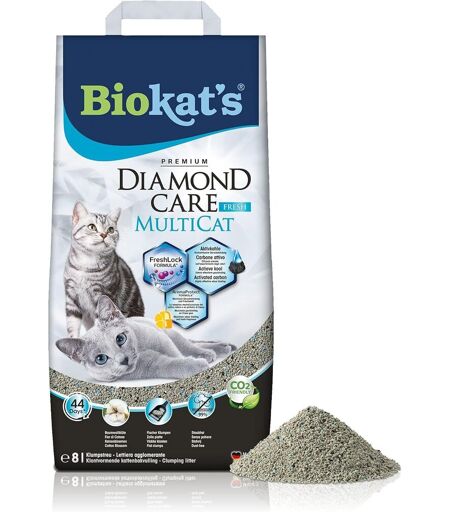 2in1 FreshLock Formula : L\u2019association entre le charbon actif et AromaProtect est spécialement adaptée aux exigences élevées des ménages à plusieurs chats CHARBON ACTIF : Fabriqué à partir d\u2019une matière première renouvelable, le charbon actif contenu assure une fixation des odeurs et absorption hautement efficaces FORMATION DES AGGLOMÉRATS : Les grains fins sont extrêmement efficaces et forment des agglomérats particulièrement plats ce qui facilite le nettoyage des toilettes du chat CONSERVATION : Refermer le sac en papier et toujours conserver la litière bentonite Biokat\u2019s au sec CONTIENT : 1 sac en papier 8 litres Biokats Diamond Care Multi Cat Fresh Litière fine au parfum de fleurs de coton \u2013 Made in Germany ...