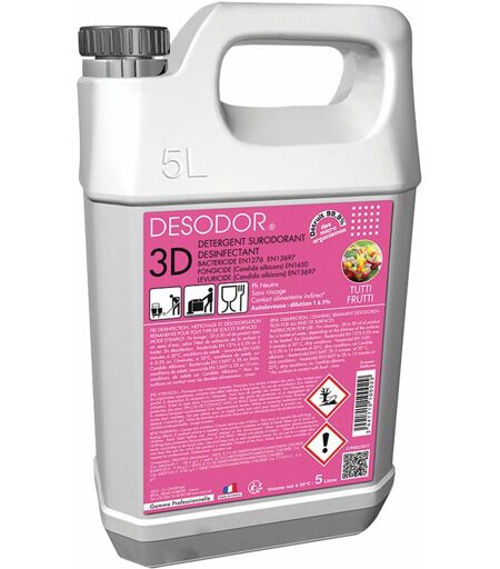 Nettoyant surodorant et désinfectant bactéricide et fongicide. Recommandées pour le nettoyage, la désinfection et la désodorisation des sols et surfaces.Senteur Tutti Frutti. Disponible en dosettes (C0371) ou bidon de 5L (C0002). Désodor 3D en dosettes (C0371) ou bidon de 5L (C0002) odeur Tutti Frutti Recommandé pour le nettoyage, la désinfection et la désodorisation des sols et surface pH neutre Sans rinçage Détruit 99.9% des micro-organismes Activités désinfectantes selon les normes : Bactéricides EN 1276 à 0,5% en 5 minutes, à 20°C, conditions de saleté sur Staphilococcus aureus, Pseudomonas aeruginosa, Escherichia coli, Enterococcus hirae. Bactéricides EN 13967 à 3% en 5 min, conditions de saleté. Levuricide EN 1650 à 0,5% en 15 minutes, à 20°C, conditions de saleté sur Candida Albican. Levuricide EN 13697 ( Candida Albicans) à 2% en 15 min, conditions de saleté. Fongicide sur Candida Albican selon EN 1650 en conditions de saleté. "Formule active sur virus enveloppés selon EN ...