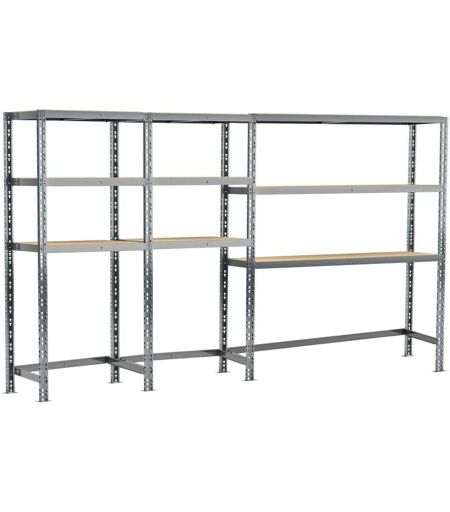 Etagère triple charge lourde de 290 cm de long. Elle comprend 2 étagères de 3 plateaux 70 cm spéciale lave-linge et sèche-linge livrée, une étagère rack de 3 plateaux 150 cm et des montants de renfort au sol anti-écartement. Utilisation double en rangement pour sèche-linge et lave-linge standard et rangement buanderie et gros rangement volumineux sur les 3 plateaux et rangement au sol de matériel de jardinage : tondeuses, aspirateurs, bouteilles de gaz. Possibilité d'extension permanente avec toutes les extensions MODULÖ STORAGE Les + du produit Idéal pour utiliser l'espace au mur, Très fonctionnel, spécial lave-linge et sèche-linge, il permet d'optimiser le rangement des moyens, des gros produits et de ranger au sol des produits encombrants en hauteur, Enorme capacité de charge de 2250 kg, répartie jusqu'à 250 kg par plateau, Modulable en hauteur grâce à ses plateaux amovibles, Grande résistance dans les endroits humides, grâce à sa structure en acier protégée par une peinture époxy ...