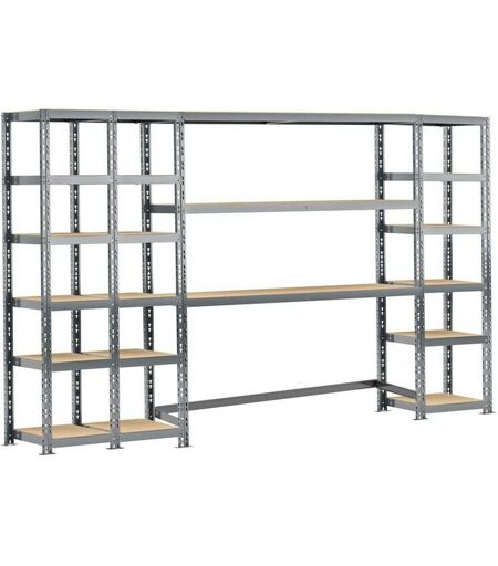 Etagère quadruple charge lourde de 300 cm de long. Elle comprend 3 étagères charge lourde de 6 plateaux 50 cm, une étagère rack de 3 plateaux 150 cm et des montants de renfort au sol anti-écartement. Utilisation concept rangement complet pour le garage permettant sur une longueur de 300 cm de ranger des petits produits comme les produits alimentaires, chaussures, livres, et des gros produits volumineux, des produits lourds. Possibilité d'extension permanente avec toutes les extensions MODULÖ STORAGE Les + du produit Idéal pour utiliser l'espace au mur, Très fonctionnel, il permet d'optimiser le rangement des produits petits, moyens, gros et volumineux, Modulable en hauteur grâce à ses plateaux amovibles, Enorme capacité de charge de 5250 kg, répartie jusqu'à 250 kg par plateau, Grande résistance dans les endroits humides, grâce à sa structure en acier protégée par une peinture époxy gris foncé, Montage rapide, sans vis ni boulon grâce à sa conception innovante d'extension des 2 côtés. ...