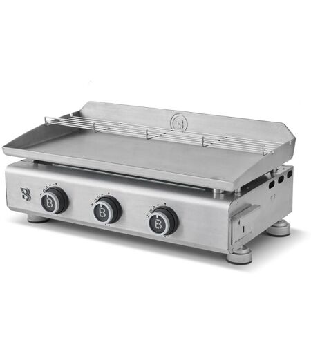 BRASERO Plancha Silvia evo 3 Feux Plaque Inox de 67 x 34 cm - 3 brûleurs - Grille de réchauffement - Piezo intégré - Tiroir Graisse avec jauge de niveu