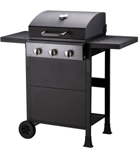 BRASERO Cooking box - Barbecue gaz sur chariot 3 feux - 3 brûleurs - Surface de cuisson en acier émaillée 49 x 39 cm - tablettes rabattables, 2 roues - Noir
