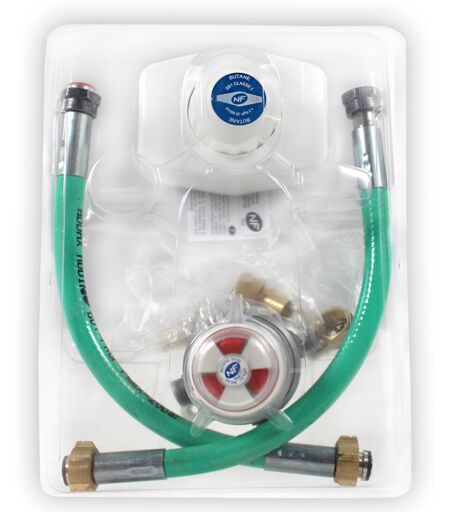 Présentation Kit complet pour une installation domestique à partir de bouteilles BUTANE commerciale. Dans ce coffret, le robinet détendeur déclencheur, s'il alimente un seul appareil, tient lieu de robinet de commande (arrêté du 28 octobre 1993). Il assure automatiquement la coupure de l'alimentation en gaz de l'appareil en cas de chute de pression amont ou aval (ou de débranchement du tube souple pour le détendeur-déclencheur SB1. Contenue du coffret : 1 inverseur automatique avec indicateur service/réserve incorporé 924B - 1 détendeur-déclencheur - 1,3 kg/h 28 mbar SB1 2 lyres 35 cm L35 - 2 raccords à souder AE12 - 1 raccord tétine ATE ...