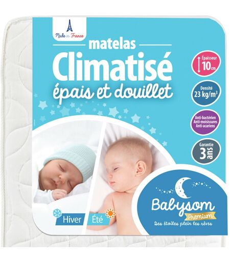 Le matelas climatisé Babysom réversible est doté de deux faces de couchage adaptées à toutes les saisons. Sa face hiver ouatinée garantit un sommeil douillet à votre bébé. Sa face été ventilée, permet quant à elle de limiter les effets de la transpiration et maintenir bébé bien au sec. Une épaisseur de 14 cm offre un confort optimal à votre bébé. Sa mousse polyuréthane 18kg/m3 offre un confort souple et son enveloppe à base de coton apporte une sensation de douceur. Traitement anti-acarien, antibactérien, et anti-moisissure garantit un sommeil sain et hygiénique. Garanti 10 ans pour une épaisseur de 14 cm et garanti 3 ans pour une épaisseur de 10 cm, notre matelas vous apportera entière satisfaction à coup sûr. Fabrication Française : qualité, traçabilité et savoir-faire Français. En Achetant ce matelas vous contribuez donc au maintien des emplois en France. Certifié Oekotex® 100-1 : interdit l'utilisation de certaines substances nocives. Label Certipur® : garantit une mousse ...