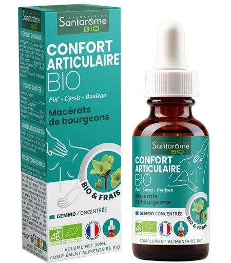 Complément alimentaire à utiliser dans le cadre d’une alimentation variée, équilibrée et d’un mode de vie sain.Santarome Bio Confort Articulaire est un complément alimentaire bio formulé à base de macérats de bourgeons de pin, cassis et bouleau, concentrés pour un confort articulaire optimal. Ce produit est 100 % bio et frais, avec une concentration élevée en principes actifs de bourgeons.IngrédientsExtraits hydro-alcooliques de bourgeons bio de pin (Pinus), cassis (Ribes nigrum), bouleau (Betula), alcool (30 % vol.), eau.Conseils d'utilisationPrendre 30 gouttes par jour, pures ou diluées dans un verre d'eau (200 ml), de préférence en dehors des repas. Bien agiter le flacon avant emploi.Précautions d'emploiComplément alimentaire. Ne se substitue pas à une alimentation variée et équilibrée. Ne pas dépasser la dose recommandée. Déconseillé aux femmes enceintes ou allaitantes, ainsi qu’aux personnes allergiques aux dérivés salicylés ou sous traitement anticoagulant. Conserver hors de portée des jeunes enfants.Poids net30 mlAdresse du FabricantLaboratoire Santarome25 rue du Général Foy75008 Paris, France ...