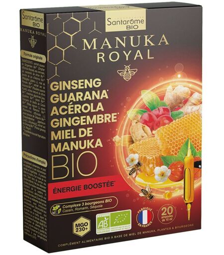 Complément alimentaire à utiliser dans le cadre d’une alimentation variée, équilibrée et d’un mode de vie sain.Santarome Manuka Royal Boosted Energy Bio est un complément alimentaire sous forme d’ampoules buvables à base de plantes, miel de manuka et bourgeons. Sa formule associe du gingembre bio, du guarana (source naturelle de caféine), de l’acerola (riche en vitamine C), du ginseng et du miel de manuka MGO 230+. Elle est complétée par trois macérats glycérinés de bourgeons : cassis, romarin et séquoia. Ces actifs soutiennent la vitalité, l’énergie physique et mentale, et renforcent les défenses naturelles. Produit certifié bio et fabriqué en France.IngrédientsExtrait aqueux de gingembre* (Zingiber officinale Roscoe), eau osmotique, jus concentré de citron*, poudre de jus d’acerola* (Malpighia glabra L.), miel de manuka*, extrait sec de guarana* (Paullinia cupana Kunth), arôme naturel de citron*, macérats glycérinés [eau, glycérine*, alcool*, bourgeon de cassis* (Ribes nigrum L.), jeune pousse de romarin* (Rosmarinus officinalis L.), jeune pousse de séquoia* (Sequoiadendron giganteum)], extrait sec de ginseng* (Panax ginseng C.A. Meyer).*Ingrédients issus de l’agriculture biologique.Valeurs nutritionnelles Pour 1 ampoule (10 ml)Équivalent plante sèche Extrait de gingembre (rhizome)7000 mg1400 mg Poudre de jus d’acerola145 mg1300 mg (plante fraîche) dont vitamine C12 mg15 % VNR Extrait de guarana50 mg300 mg dont caféine4 mg- Miel de manuka50 mg- Macérat de cassis (bourgeon)50 mg- Macérat de romarin (jeunes pousses)50 mg- Macérat de séquoia (jeunes pousses)50 mg- Conseils d'utilisationPrendre 1 ampoule par jour, diluée dans un verre d’eau (environ 200 ml). Agiter avant emploi. Durée conseillée : 20 jours.Précautions d'emploiContient de la caféine (4 mg/ampoule). Déconseillé aux enfants de moins de 12 ans, femmes enceintes ou allaitantes, personnes allergiques aux produits de la ruche, asthmatiques ou avec terrain atopique. Ne pas dépasser la dose journalière recommandée. Tenir hors de portée des enfants. À conserver à l’abri de la lumière, de la chaleur et de l’humidité (T° < 25°C). Un dépôt naturel peut apparaître sans altérer la qualité du produit.Poids net20 ampoules de 10 ml = 200 mlAdresse du FabricantSantarome1 rue de la Nau des Vignes51520 La VeuveFrance ...