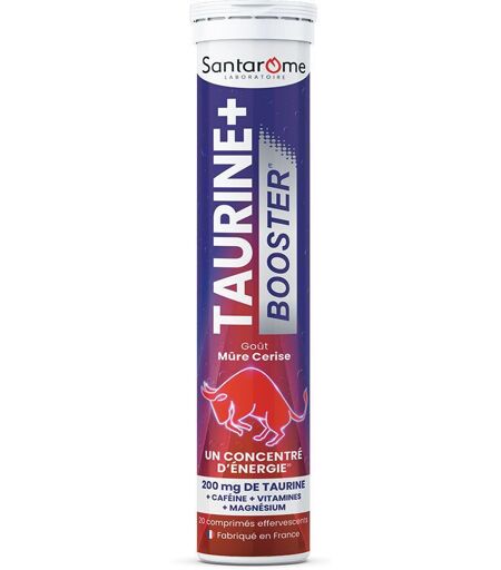 Complément alimentaire à utiliser dans le cadre d’une alimentation variée, équilibrée et d’un mode de vie sain.Complément alimentaire à base de de Taurine, Caféine, Guarana, Vitamines et Magnésium avec édulcorants.Les occasions de prendre Taurine + Booster : Sport, Études, Travail. Un concentré d'énergie avec de nombreux actifs :- Vitamines B3 B5 B6 : contribuent à un métabolisme énergétique normal.- Vitamine C : contribue à réduire la fatigue.- Magnésium : contribue à une fonction musculaire normale.BénéficesSans conservateursSans colorantArômes naturelsVeganRecyclableFabriqué en FranceIngrédientsAcidifiant : acide citrique, correcteur d’acidité : bicarbonate de sodium, édulcorant : sorbitol, acide L-ascorbique, taurine, oxyde de magnésium marin, caféine, arôme naturel de mûre, arôme naturel, extrait sec de graine de Guarana (Paullinia cupana Kunth), antiagglomérant : polyéthylène glycol, nicotinamide, édulcorant : sucralose, D-pantothénate de calcium, chlorhydrate de pyridoxine.Valeurs nutritionnelles Ingrédient Quantité % VNR* Vitamine C (acide L-ascorbique) 200 mg 250% Taurine 200 mg — Magnésium (oxyde de magnésium marin) 56,25 mg 15% Caféine 90 mg — Extrait sec de graine de Guarana (Paullinia cupana Kunth) 45 mg — dont caféine 10 mg — Vitamine B3 (nicotinamide) 16 mg 100% Vitamine B5 (D-pantothénate de calcium) 6 mg 100% Vitamine B6 (chlorhydrate de pyridoxine) 1,4 mg 100% *VNR : Valeurs Nutritionnelles de RéférenceConseils d'utilisation1 comprimé par jour à dissoudre dans un grand verre d'eau (20cl), de préférence le matin.Précautions d'emploiComplément alimentaire avec édulcorants, ne peut se substituer à une alimentation variée et équilibrée ni à un mode de vie sain. Ne pas dépasser la dose journalière recommandée. Tenir hors de portée des jeunesenfants. Réservé à l’adulte. Contient de la caféine (100 mg/comprimé), déconseillé aux enfants, adolescents, femmes enceintes ou allaitantes. Déconseillé encas d’ulcère gastro-duodénal, de troubles cardiaques ou d’hyperthyroïdie. En cas de traitements médicamenteux, demander conseil à un professionnel de santé. Une consommation excessive peut avoir des effets laxatifs.À conserver dans un endroit frais et sec, à l’abri de la lumière et à une température inférieure à 25°C.Poids net20 comprimésAdresse du FabricantSANTAROME25, rue du Général Foy 75008 Paris ...