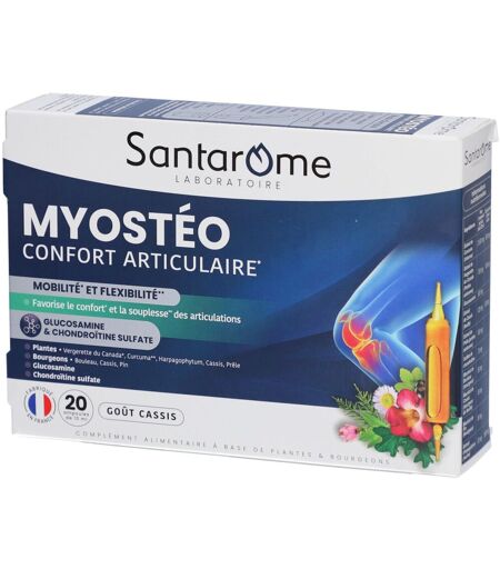 Complément alimentaire à utiliser dans le cadre d’une alimentation variée, équilibrée et d’un mode de vie sain.Santarome Myostéo Confort Articulaire est un complément alimentaire élaboré pour soutenir la souplesse, la mobilité articulaire et le confort des articulations. Disponible en comprimés ou en ampoules, il associe des actifs d’origine naturelle comme le curcuma, le gingembre, l’ortie ou encore le collagène marin, le PEA et le MSM. Il intègre également un complexe unique PGA (phyto-gemmo-aroma) avec des bourgeons et des huiles essentielles. La vitamine C et le manganèse complètent la formule pour soutenir la formation normale du cartilage et des tissus conjonctifs.IngrédientsEau purifiée, extrait aqueux de curcuma, sulfate de D-glucosamine (CRUSTACÉS), extrait de vergerette du Canada, sirop d’agave, jus concentré de cassis, extrait sec de cassis, extrait sec de prêle (titré en silice), sulfate sodique de chondroïtine (POISSON), macérats glycérinés (cassis, bouleau, pin), extrait sec d’harpagophytum.Allergènes : Crustacé, Poisson.Valeurs nutritionnelles Pour 1 ampoule (10 ml)Équivalent plante sèche Extrait de curcuma2500 mg500 mg Extrait de vergerette du Canada750 mg150 mg Glucosamine500 mg- Extrait de cassis125 mg500 mg Extrait de prêle100 mg- Chondroïtine70 mg- Macérat de bouleau50 mg- Macérat de cassis50 mg- Macérat de pin50 mg- Extrait d’harpagophytum33 mg500 mg Conseils d'utilisation1 ampoule par jour, diluée dans un verre d’eau (20 cl), de préférence le matin.Précautions d'emploiRéservé à l’adulte. Déconseillé aux femmes enceintes, allaitantes, aux personnes sous anticoagulants, immunosuppresseurs, ou présentant des troubles hépatiques, biliaires, digestifs, cardiovasculaires ou rénaux. Demander l’avis d’un professionnel de santé en cas de traitement médical. Ne pas dépasser la dose recommandée. Ne pas utiliser de manière prolongée. Tenir hors de portée des enfants. Conserver à l’abri de la lumière, de la chaleur et de l’humidité.Poids net20 ampoules de 10 ml = 200 mlAdresse du FabricantLaboratoire SANTAROME25, rue du Général Foy75008 Paris, France ...