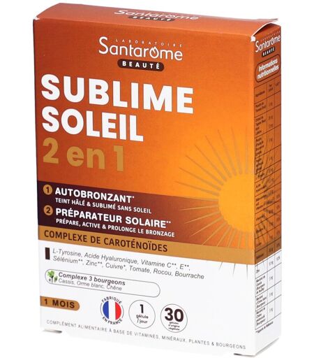 Complément alimentaire à utiliser dans le cadre d’une alimentation variée, équilibrée et d’un mode de vie sain.Complément alimentaire 2en1 formulé pour préparer la peau au soleil tout en offrant un effet autobronzant. Contient un complexe de caroténoïdes (bêta-carotène, lycopène, lutéine), de la L-tyrosine (précurseur de la mélanine), de l'acide hyaluronique, des vitamines C et E, ainsi que du cuivre, du zinc et du sélénium. Ces nutriments contribuent à une pigmentation normale de la peau, à la formation de collagène, à la protection contre le stress oxydatif et à l’hydratation. Enrichi en extraits de plantes (roccou, tomate, bourrache) et macérats de bourgeons (chêne, orme, cassis).IngrédientsPoudre de tomate (fruit) 5 mg, extrait de tomate (fruit) 5 mg (dont lycopène 0,5 mg), extrait de tagète (fleur) 26 mg (dont lutéine 13 mg), poudre d'huile de bourrache (graine) 5 mg, poudre de rocou (graine) 5 mg, L-tyrosine 20 mg, acide hyaluronique 13,5 mg, bêta-carotène 4,8 mg soit 800 μg ER, vitamine C 40 mg, vitamine E 12 mg, cuivre 1 mg, sélénium 50 μg, zinc 10 mg, macérat de bourgeon de chêne pédonculé 5 mg, macérat de bourgeon d’orme blanc 5 mg, macérat de bourgeon de cassis (feuille) 26 mg.Valeurs nutritionnelles Pour 1 gélule%VNR* Lycopène0,5 mg- Lutéine13 mg- L-Tyrosine20 mg- Acide hyaluronique13,5 mg- Bêta-carotène4,8 mg (800 µg ER)- Vitamine C40 mg50 % Vitamine E12 mg100 % Cuivre1 mg100 % Sélénium50 µg91 % Zinc10 mg100 % Macérat de bourgeon de chêne5 mg- Macérat de bourgeon d’orme5 mg- Macérat de bourgeon de cassis26 mg- Conseils d'utilisationPrendre 1 gélule par jour avec un grand verre d’eau, 15 jours avant l’exposition au soleil, pendant l’exposition et après pour prolonger l’effet.Précautions d'emploiRéservé à l’adulte. Ne pas dépasser la dose journalière recommandée. Ne convient pas aux femmes enceintes, allaitantes ou post-ménopausées. Déconseillé en cas d’insuffisance cardiaque ou rénale œdémateuses. Le bêta-carotène est déconseillé aux fumeurs. Ce produit ne remplace pas une protection solaire. Toute exposition au soleil doit être modérée et protégée. Conserver à l’abri de la lumière, de la chaleur et de l’humidité.Poids net30 comprimés = 12 gAdresse du FabricantLaboratoire SANTAROME25, rue du Général Foy75008 Paris, France ...