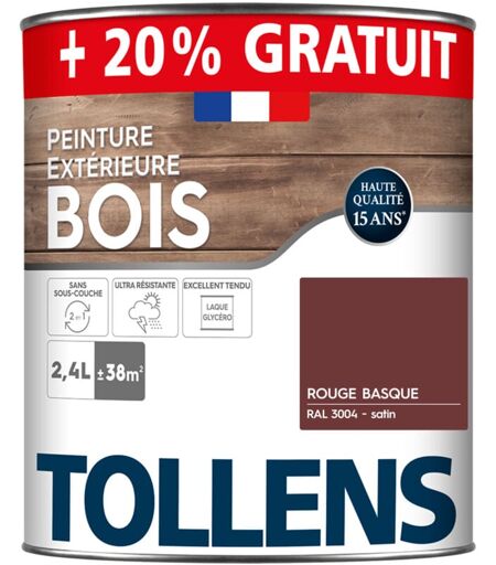 Peinture bois extérieur 2 en 1 - Ultra Résistante et économique - TOLLENS - Satin - Rouge Basque RAL 3004 - 2L+20%=38m2 Bois. Blanc et couleurs Points forts : ULTRA RÉSISTANTE : Laque riche en résine. Préserve le film et les couleurs des intempéries, des U.V et des chocs. Tendu lisse exceptionnel facilitant l'entretien. ÉCONOMIQUE : Rendement élevé. Couvre le support dès la première couche grâce à son opacité et son pouvoir garnissant. ESTHÉTIQUE PARFAITE ET DURABLE : Brillance éclatante et tendu élégant. Permet un entretien facile grâce à un film parfaitement tendu et extrêmement résistant. UTILISATION PRATIQUE ET POLYVALENTE : Toutes boiseries extérieures. Application directe sans sous-couche sur fenêtre, volet, porte, portail, abris, clôture et mobilier de jardin… Caractéristiques techniques Aspect : Satin Conditionnement : 2,4 L Pièce : Support : Rendement : 16 m²/L Surface couverte : 38m² ...