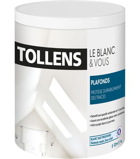 Tollens - Peinture Plafond Blanc - Toutes pièces Limite les Traces de Rouleau - Monocouche - Blanc Mat 1L = 12m2