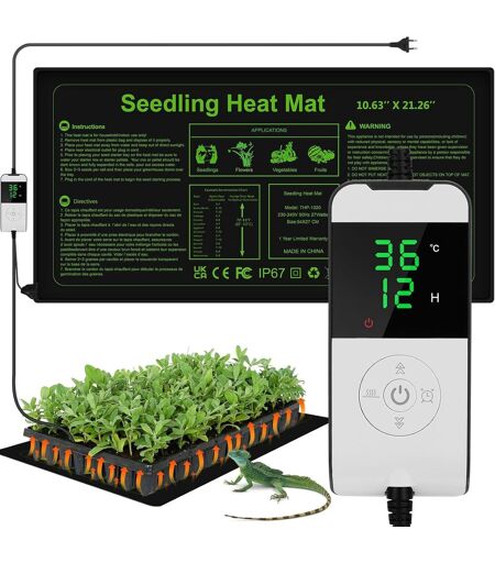 CONTRÔLE DE LA TEMPÉRATURE AVEC FONCTION DE MINUTERIE AMÉLIORÉE - Notre tapis chauffant pour semis est équipé d'un contrôleur de thermostat et d'un programmateur de temps, il suffit de placer la sonde de température dans la zone de contrôle de la température et de régler la température et le temps souhaités pour 0 à 12 heures. AUGMENTER LE SUCCÈS DE LA GERMINATION - Le tapis chauffant est équipé d'un moteur amélioré de 50W pour chauffer la zone des racines 10-20¿au-dessus de la température ambiante plus rapidement, améliorant ainsi la santé et la vitesse de la germination des graines. Vous pouvez régler la température de croissance appropriée en fonction des besoins dans différents environnements d'utilisation. Parfait pour les semences et la propagation par boutures. LARGE ET FACILE À NETTOYER - La taille du tapis chauffant pour plantes est de 54 x 27 cm. Équipé d'un cordon d'alimentation de 70 pouces et d'un cordon de sonde de 49 pouces, il est idéal pour n'importe quel endroit où vous souhaitez le placer. Fabriqué en PVC imperméable et résistant à l'usure, il est très ductile et facile à nettoyer. SÛR ET DURABLE - Double protection de chaque côté, isolation haute tension. La couche de surface en PVC recouvre complètement le fil chauffant, ce qui ne pose aucun risque de sécurité en cas d'utilisation continue. ATTENTION : 1) NE PAS immerger le tapis chauffant dans l'eau. 2. Ne pas l'utiliser sur des surfaces rugueuses, abrasives ou tranchantes. 3. Ne pas l'utiliser pour réchauffer des personnes. TAPIS CHAUFFANT MULTIFONCTIONNEL - Outre le chauffage des semis et la germination des plantes, ce tapis chauffant peut également être utilisé comme source de chaleur idéale pour alimenter les terrariums, les reptiles et les serres d'intérieur (Remarque : ce tapis chauffant pour semis est principalement destiné à un usage intérieur, pour une meilleure croissance des plantes, vous pouvez utiliser un dôme de serre au-dessus de vos semences)..La livraison depuis la France est prévue dans 5 jours ouvrés, n'hésitez pas à passer votre commande ...