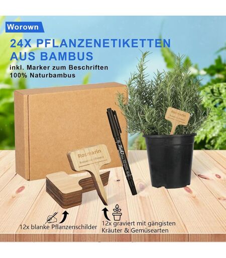 Kalanka-Lot De 24 Étiquettes Pour Plantes En Bambou En Forme De T, 12 Vierges À Écrire Au Hasard, 12 Avec Noms De Fleurs Et Légumes Gravés, Avec Marqueur À Huile Noir, Résistant À L'eau